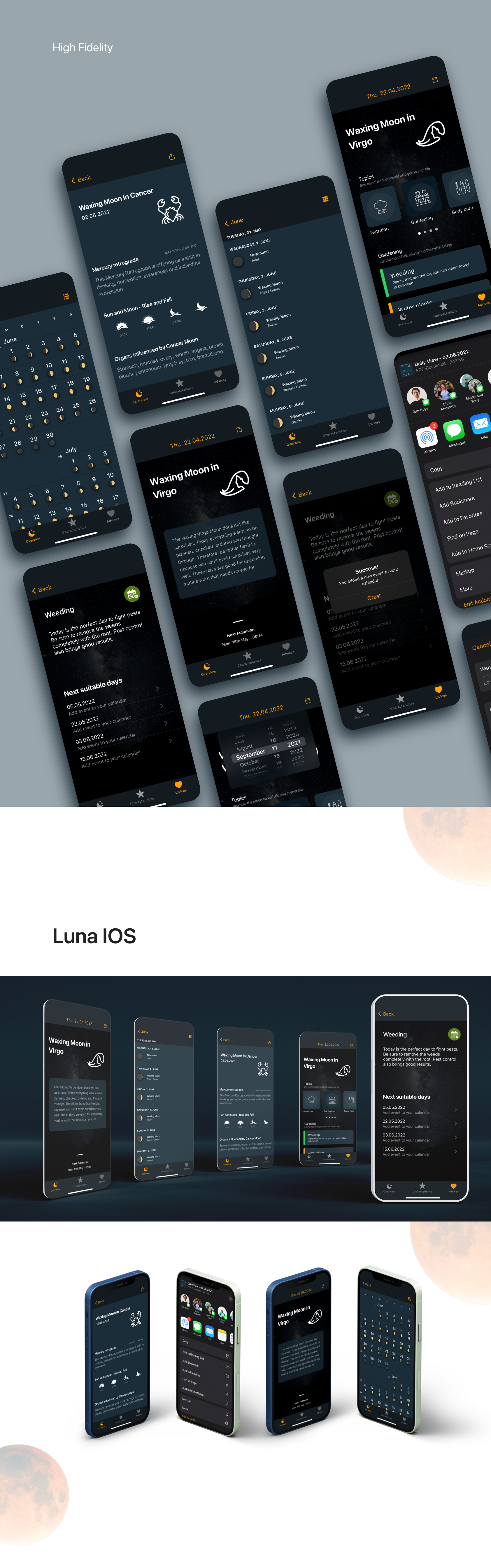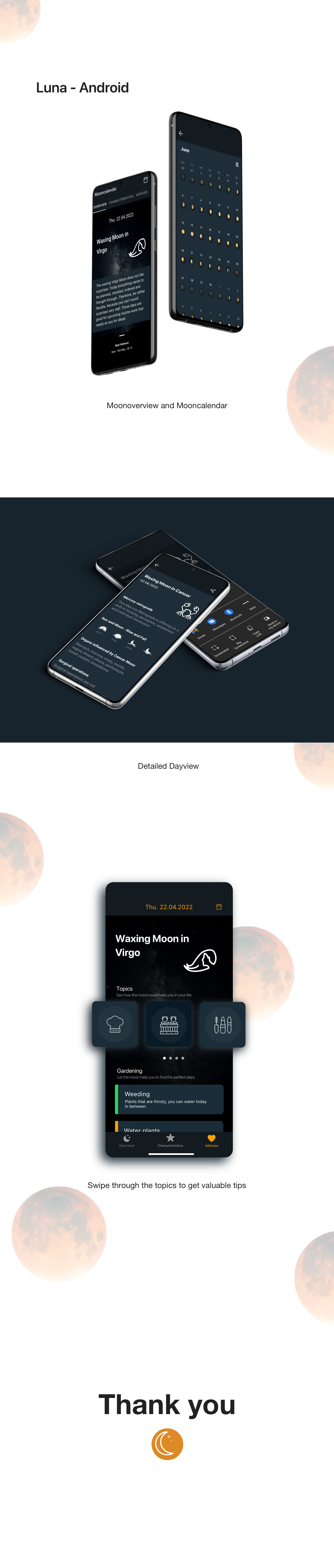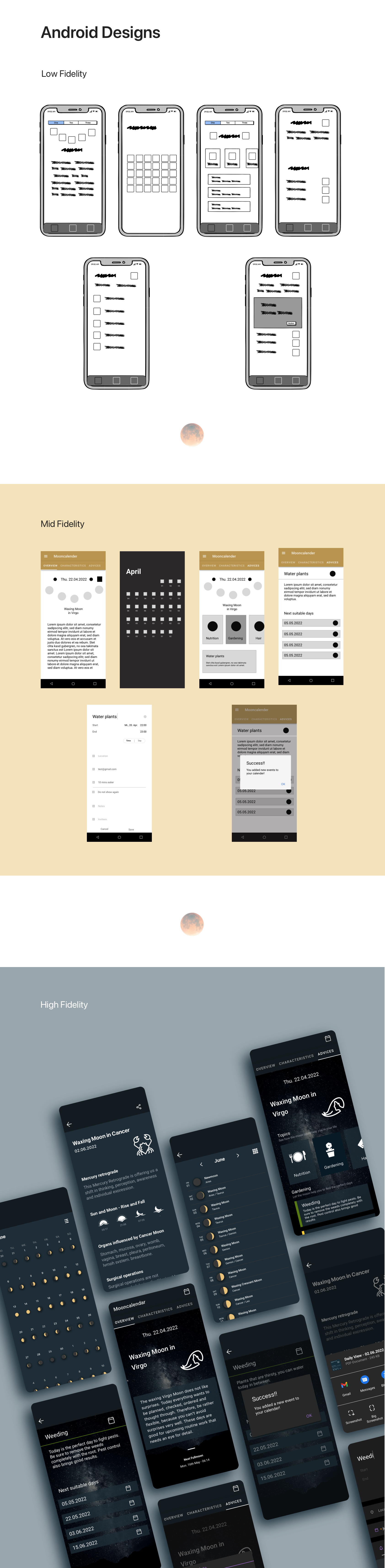 As someone who integrates the moon into their daily routine, this project affected me personally. For this design, the focus was on creating a version for iOS and one for Android and internalizing the guidelines.